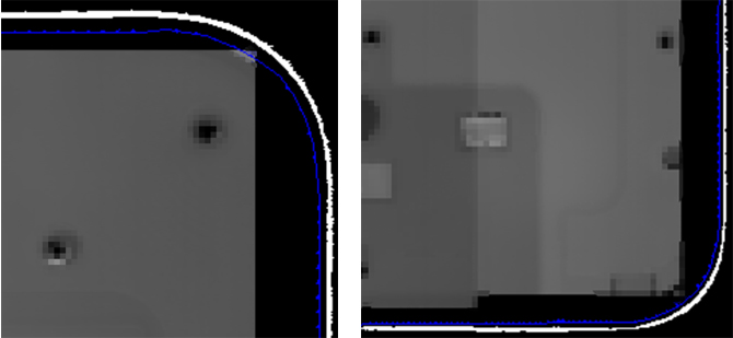 通過三維激光傳感器掃描得到手機(jī)中框的原始灰度圖像,再通過視覺算法分割出TP片和粘膠面?zhèn)缺谶?br>緣,實(shí)現(xiàn)高精度、穩(wěn)定的抓邊。再根據(jù)噴膠標(biāo)準(zhǔn),設(shè)定合適的偏移,實(shí)現(xiàn)噴膠引導(dǎo)。